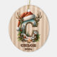 This charming ornament features the letter "C" adorned with rustic holiday details, including a cozy Santa hat and festive reindeer antlers. Inside the rustic letter C, a picturesque winter scene showcases a tent, campfire, snowy mountains, and towering pine trees, creating a warm and inviting outdoor feel. Personalize with name and year. This ornament is perfect for nature lovers and fans of rustic holiday decor. The beige-striped background adds a vintage touch, making it a unique keepsake for the holiday season that blends adventure with holiday cheer.