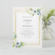 An elegant, rustic wedding invitation featuring a lush, stylish floral frame of white anemones, eucalyptus and other greenery, berries and other flowers, painted in watercolor with a blue theme; as well as a hand-brushed gold frame (not real gold, this is a digital effect), over a cream background. The title, "wedding" is in modern calligraphy with delicate flourishes. A lovely spring, summer or fall wedding choice for brides who love gold, blush, anemones, eucalyptus greenery, variety in their bridal bouquet, a boho touch and rustic elegance.