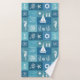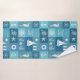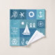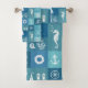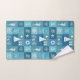 Vintage Nautical Icons Board Pattern Bath Towel Set. This design features a coastal board chequered with retro textured patchwork white summer symbols light blue seamless pattern designs in a mix of blue, white, aqua, and turquoise, the towels highlight boat anchor, seahorse, corals, shell, lack house and boat. This vintage nautical icons board monochrome blue Vector Pattern with classic turquoise blue and white colour scheme will be perfect as personalized gift.