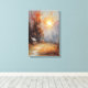 This AI-generated landscape artwork stretched canvas art print captures the serene beauty of autumn in the countryside. A rustic cabin nestles among towering trees, their leaves a blend of warm oranges, reds, and browns, reflecting the rich tones of fall. The glowing sun casts a soft, golden light over the peaceful setting, creating a tranquil and nostalgic atmosphere. The brushstroke-inspired texture gives this piece an impressionistic feel, perfect for those who appreciate rustic or nature-inspired home decor. This artwork evokes the quiet charm of an autumn morning, ideal for cozy living spaces, cabins, or any room that needs a touch of warmth and nature. The hazy background adds depth to the scene, while the soft lighting highlights the natural beauty of the season. It's a timeless fall landscape that brings the calming essence of the outdoors into your home.