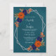 Rustic autumn floral wedding: Navy blue and terracotta burnt orange floral with fall foliage. Features teal blue and modern script typography