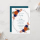 Rustic autumn floral wedding: Navy blue and terracotta burnt orange floral with fall foliage. Features teal blue and modern script typography