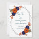 Rustic autumn floral wedding: Navy blue and terracotta burnt orange floral with fall foliage. Features teal blue and modern script typography