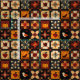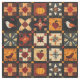 This fabric features a rustic patchwork quilt pattern arranged in a cozy grid of fabric blocks. Each block highlights unique autumnal motifs such as pumpkins, birds, apples, and hearts, alongside intricate geometric patterns including stars, squares, and floral or snowflake-inspired designs. Rendered in warm earthy tones of orange, red, brown, and cream against a deep dark background, the quilt captures the essence of fall and harvest season. With contrasting borders between the blocks, this farmhouse-style folk art design is perfect for Thanksgiving décor, rustic crafts, fabric-inspired DIY projects, and country-style autumn home design.