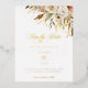 The romance of an Autumn wedding is captured in this elegant design featuring watercolor roses and greenery in warm Fall colours of terracotta, ivory, rust, chestnut, dusty blue and sage green with touches of gold foil sparkles. This design also features unique text graphics in a custom calligraphy script font with colour that can be customized using the design editor tool as well as real gold foil text.