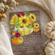 Beautiful watercolor yellow sunflowers floral bouquet pumpkins set on a rustic faux wood background. Visit our shop to view our entire sunflower floral collection