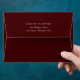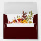 Rustic watercolor Autumn foliage and floral in pretty shades of yellow, pink, orange red, green and brown, rustic burgundy envelope. Features, return address on back flap.