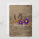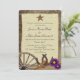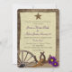Antique wagon wheel and rustic country barn wood "tie the knot" rope and horseshoes design invitation with western antiqued star and lavender purple daisy flowers.