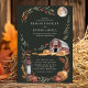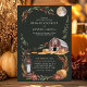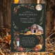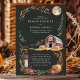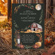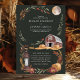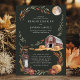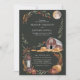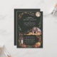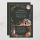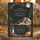 This rustic wedding invitation captures the charm of an autumn evening with a cozy barn, hay bales, and a vintage lantern under the soft glow of a full moon. Framed by warm autumnal leaves, the deep green background accentuates the rich earthy tones, creating a serene and inviting atmosphere perfect for a countryside wedding. This design is ideal for couples seeking a romantic, rustic theme for their special day.
