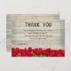 Wedding thank you card, featuring a rustic weathered barn wall, fronted with bright red tulips