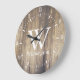 Light brown barn wood planks print clock with white roman numerals and tick marks for hours and minutes plus your personalized monogram letter and full family name in white.