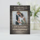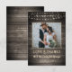 Your wedding photo is accented with a rustic, country, brown weathered barn wood background and soft antique white or light yellow glowing string lights along with the title of LOVE & THANKS and your wedding date in a country western hand-printed font and your name in a rough brush script font. The back of the card features the same wood plank background and offers a place to type your thank-you message.