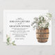 Elegant wedding invitations featuring a rustic wooden wine barrel with your initials engraved on the side, trendy white floral & green foliage flower display, and a fancy wedding template that is easy to personalize.