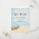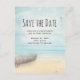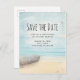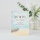 Save the date postcard with a beautiful rustic image. Subtle colours of light blue, sandy brown and gentle white. A beach scene with a boat on the shore and a faded lighthouse off in the distance with birds flying around. An elegant shabby look.