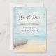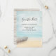 Party save the date card with a beautiful and tranquil image. Subtle colours of light blue, sandy brown and gentle white. A beach scene with a boat on the shore and a faded lighthouse off in the distance with birds flying around. An elegant shabby look.
