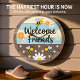 This charming round wall clock features a cozy, rustic design perfect for a farmhouse kitchen or entryway. The clock face is divided into a light blue and cream striped upper half and a weathered dark wood-grain lower half. Adorable cartoon honey bees with friendly smiles fly among scattered white and orange daisies across the entire surface. Centered in bold, black cursive script are the words "Welcome Friends," creating a warm and inviting atmosphere for any home. The perimeter is styled with a distressed wood-plank look and features simple numeric markers for easy timekeeping. This functional home accessory is an ideal housewarming gift or a seasonal spring decoration. Its blend of whimsical character art and classic rustic textures provides a cheerful and welcoming focal point for your interior living space.
