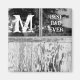 This magnet features a black and white photo of distressed wood and windows along with customizable initial and message.