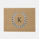 This rustic style doormat features a burlap look background, and a black and white laurel wreath with your monogram in the centre.