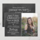 Announce your graduate in style with this whimsical style photo graduation announcement that features a black chalkboard textured background look with handwritten white chalk text, scrolls, and doodles next to a portrait photo space. The back of these stylish cards can be customized as invitations for a graduation party to celebrate the occasion.