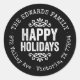 Affordable custom printed round return address stickers personalized with your family name and return address. This rustic modern holiday design features distressed HAPPY HOLIDAYS lettering on a black background. Use the design tools to choose any background colour and edit text fonts and colours to further customize your own unique holiday return address labels.