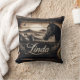A detailed wood carving showcases a black horse beside farmhouses against a sunset backdrop, personalized with the name Linda.