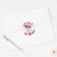 Pretty baby shower favour seal featuring a watercolor pink & purple floral bouquet set on a wood background.