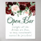 Sophisticated watercolor floral garland shower, birthday, or reception "Open Bar" table signage featuring burgundy marsala red and blush pink hand-painted header drop border with navy blue accent flowers embellished by botanical laurel and dark red. From the "Boho Bloom" collection, this layout incorporates rich Bohemian wildflowers with radiant blooms and eucalyptus greenery foliage. For other colors or matching products, please visit the JustFharryn Zazzle store, or contact the designer, c/o Fharryn@yahoo.com All rights reserved. #bohochic #zazzlemade