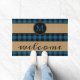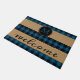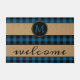 Fun doormat with contemporary black and blue chequered plaid pattern on burlap background. Stylish rustic unique design with room to customize or personalize with your family name monogram. Original personalized monogrammed outdoor decor accent for decorating the front porch or yard of your country cottage house, log cabin, mountain lodge, fishing camp, lake or river vacation home.