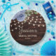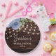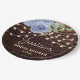 Rustic dark brown wood bridal shower paper plates with periwinkle blue watercolor floral and glittering string lights, customized with the bride's names and shower date. Contact us for help with customization or matching products.