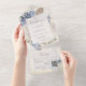 AVAILABLE WITH OR WITHOUT A QR CODE OR WITH OR WITHOUT DINNER SELECTION OPTIONS. This design features a beach themed frame of dusty blue coral, tan, cream and brown shells and starfish and sea life on a soft cream background that has been distressed with champagne gold. Add a QR code to your invitation so that gusts can quickly access your wedding Website for details, directions, menu options, and more, or add your gift registry Web URL. Personalized All-In-One invitations are a unique combination of both a beautifully printed custom invitation with an easy to tear off perforated RSVP postcard. And they are so easy to use! You simply fold, then seal the back flap with the three included clear stickers, and mail. And when your guests receive your custom invite, they just tear the perforated RSVP Card off and drop it back in the mail to you!