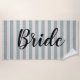 Simple stylish blue and ivory striped beach towel personalized with large Bride script lettering or customize it with your name or other text. Use the design tools to change the text fonts and colours or add your own photos to create a one of a kind personalized beach towel for your bachelorette party, honeymoon or a unique wedding gift.