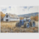 A rustic watercolor painting featuring a classic blue tractor parked near a weathered white barn, capturing the timeless charm of country life.