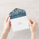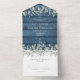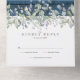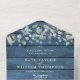 All in one wedding invitation featuring pretty watercolor greenery foliage and elegant modern typography on a blue rustic wood panels background. The invitation includes a perforated RSVP card that can be individually addressed or left blank for you to handwrite your guest's address details. Designed by Thisisnotme©