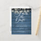 This rustic save the date card features string lights and an elegant script save the date above your details set in elegant typography on a blue rustic wood panels background. The reverse has additional save the date details, including your wedding website, with your return address and space for your recipient's address. Designed by Thisisnotme©