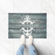 Nautical boating doormat on printed grey turquoise driftwood reading your custom boat name surrounded by a ship's well and anchor.