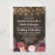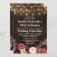 Rustic Bohemian Marsala Peony Wedding Invitations - features a rustic barn wood background with string lights. The bottom features various elegant watercolor peony flowers, roses and floral elements in shades of grey, pink, burgundy, wine and Marsala.