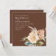 An elegant wedding invitation set featuring watercolor florals in rustic beige, burnt orange, sienna tones on a brown background.
