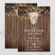This rustic Boho Save the Date wedding announcement features a floral cow skull with pretty yellow flower string lights on a barnwood background. -