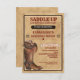 Saddle up, partner! It's time to tip your hat to the triumphs of the trail and celebrate your academic rodeo. The invitation features a rustic, sepia-toned background reminiscent of the vast prairies, adorned with weathered leather textures and classic cowboy hat and lasso motifs. A sun setting on the horizon symbolizes the end of one chapter and the beginning of another.