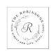 Custom-designed round return address stamp featuring elegant script monogram encircled in a modern rustic botanical wreath design.