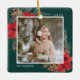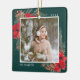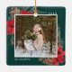 A beautiful rustic chic Christmas photo ornament featuring your favorite square photos (one on each side) surrounded by a thin white border with painted watercolor branches, boughs, red flowers and pine cones peeking out at the corners. Personalize with the year and your family name.