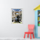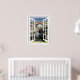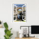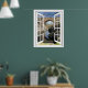 Beautiful rustic bridge scene window view with flowing river and blue sky. Picture of old bridge view through window on custom poster print.