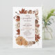 Fall themed floral and foliage baby shower invitation featuring a lovely arrangement in autumn colors of brown and beige, two pumpkins, beige frame and modern calligraphy heading. Ideal for someone looking for a rustic fall baby shower invitation.