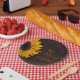 Rustic wedding country brown wood grain yellow sunflower dinner reception round paper plates. Beautiful simple flower print design. Image copyright Marg Seregelyi Photography.