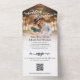 All in one wedding invitation you can personalize with a photo. Wedding celebration is written in a rustic brush script decorated with leaves across the top of your photo. A matching look for RSVP written on the rsvp card personalized with a QR code and link to wedding website to RSVP online, and for kindly deliver to written on the envelope part of the all in one invitation.