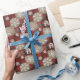 Premium wrapping paper with a cozy repeating pattern of red buffalo plaid, burlap snowflakes, white barns with wreaths, string lights, pine sprigs, and holly on a textured background—perfect for farmhouse holiday gifts.