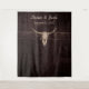 Rustic bull cow skull western country cowboy wedding dinner reception photo booth backdrop. Customized brown texture farmhouse style for the bride and groom. Old wild west vintage antique inspired marriage prop. Cool, trendy, modern farm animal design. Customize your typography. Image copyright Marg Seregelyi Photography.