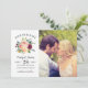 Announce your wedding in style with these modern save the date announcement cards that feature a portrait engagement photo accented with a summer and fall floral bouquet of watercolor flowers in shades of burgundy red, yellow, and blush pink, with greenery. Personalize the dark grey text with all of the important details. A coordinating burgundy background with textured appearance dresses up the back of the card.