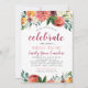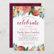 This elegant boho style wedding bridal shower invitation design features "celebrate the bride-to-be" wording with a rustic summer and fall floral watercolor border design with roses, dahlias, peony flowers, and greenery in a gorgeous palette of burgundy red, golden yellow, peach orange, blush pink, and shades of green. Personalize the custom text with the bride's name, event, and registry information. A burgundy red background with textured appearance dresses up the back of the card.