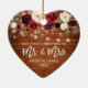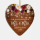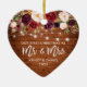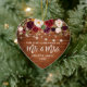 Rustic Wood, Modern Brush Script, Watercolor Burgundy Marsala Floral, Our First Christmas as Mr. and Mrs. Heart Wedding Ornament with String Lights
